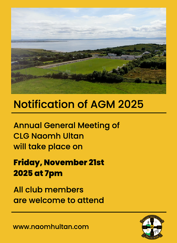 A final reminder that our clubโs AGM will take place this Friday, November 21st at 7:00pm, upstairs in the clubhouse at Pรกirc Naomh Ultan.